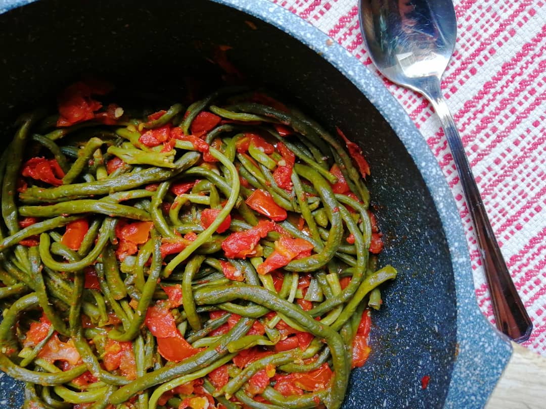 1️⃣ Lavare e pulire le stringhe eliminando gli apici. Tagliare a cubetti i pomodori.