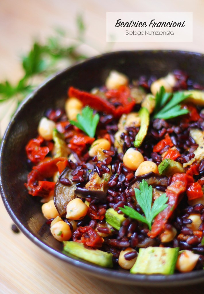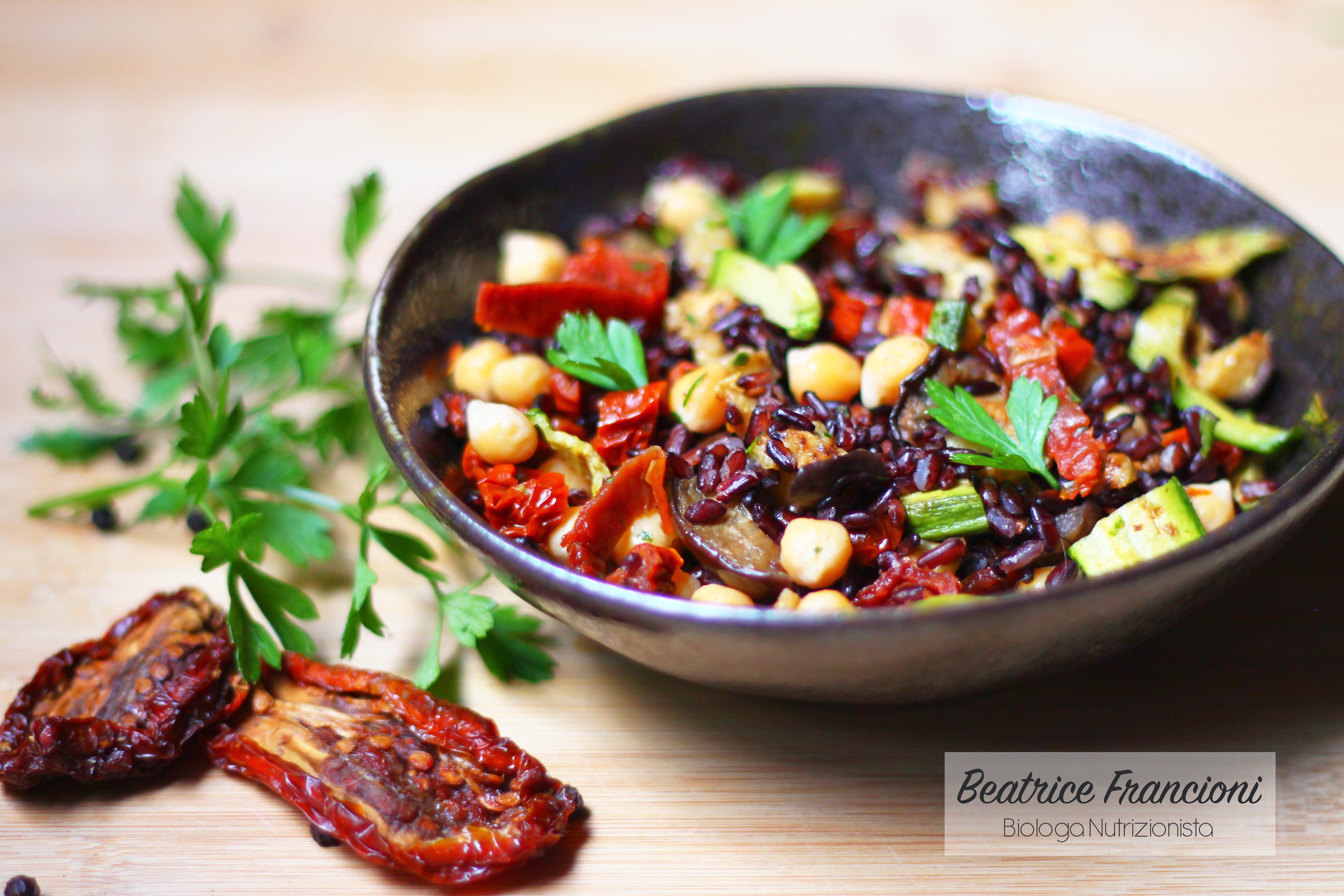 Riso venere con verdure grigliate, pomodori secchi e ceci.