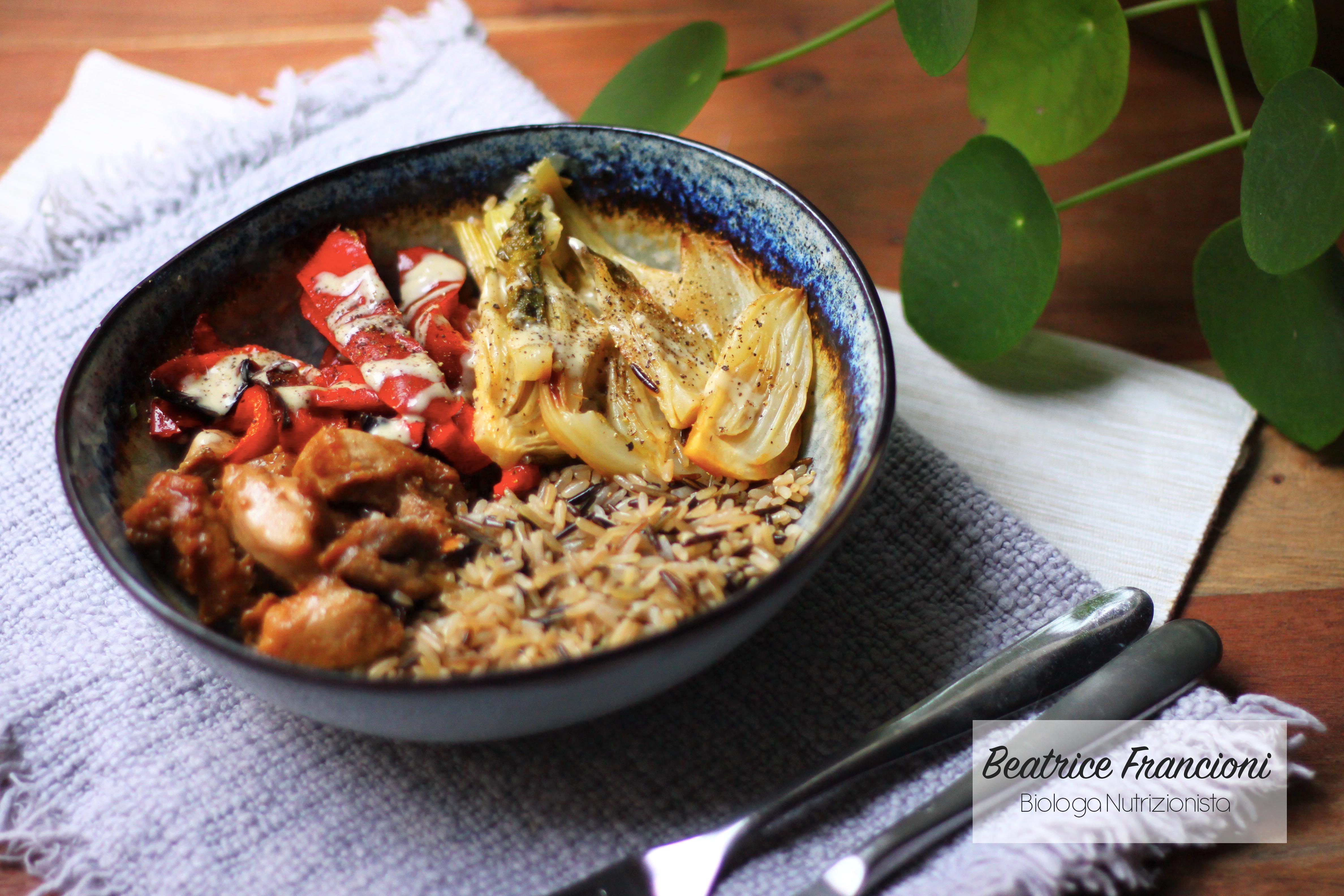 Le bowls “letteralmente, le ciotole” sono piatti unici completi contenenti una base di cereali (generalmente riso), una fonte di proteine (es. legumi, pesce, carne bianca, derivati della soia, uova ecc.), una fonte di fibre (verdura cotta/cruda) e grassi da condimento (olio EVO, tahina, frutta secca, semi).