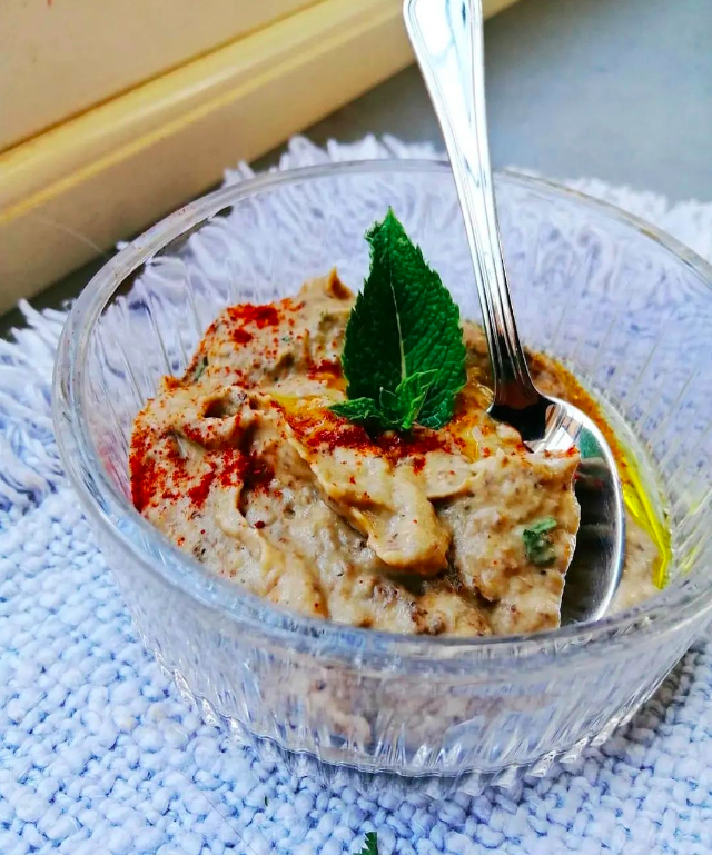 Basta dividere in due la melanzana e cuocerla in forno (ogni parte a “faccia in giù”) a 200°C per un oretta. Ricavare poi la polpa con un cucchiaio e frullare con olio, sale, pepe, tahin e succo di limone. Aggiungere qualche foglia di menta tritata e uno spicchio di aglio spremuto o tritato. Spolverare di paprika forte (facoltativo).