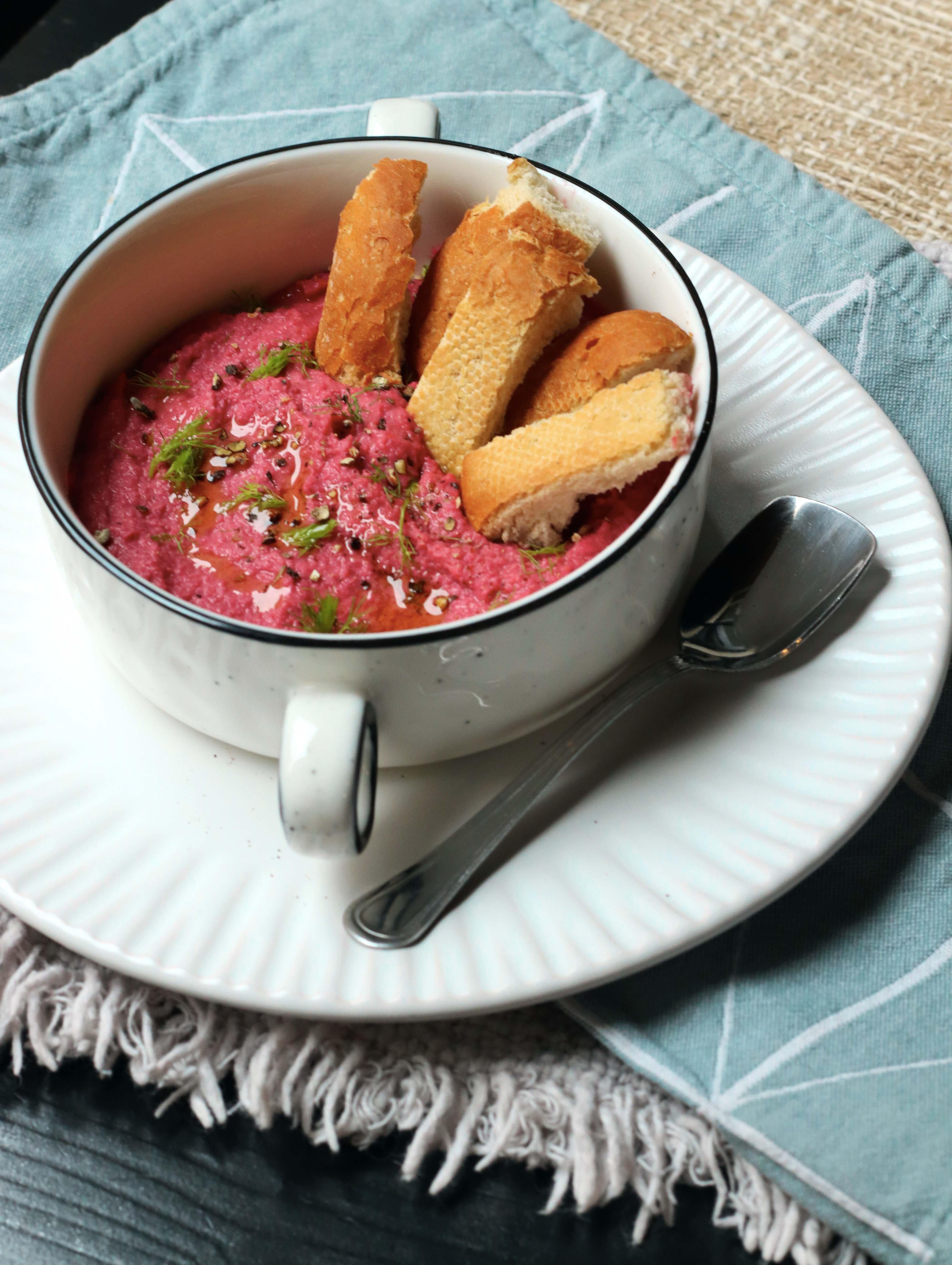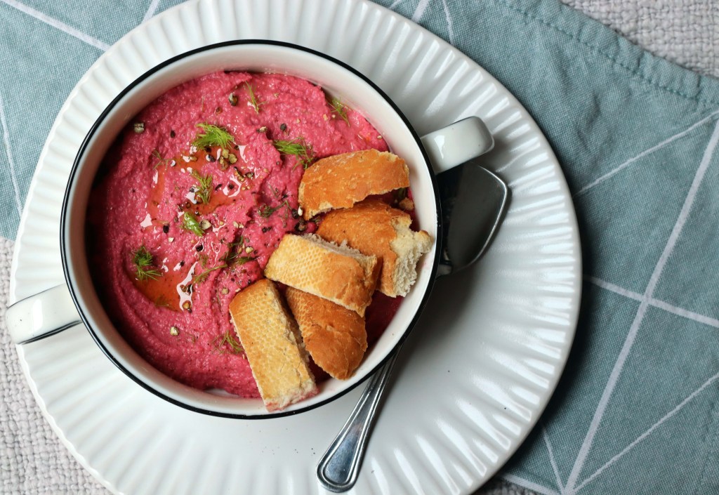 Il procedimento è molto molto semplice: basta mettere tutti gli ingredienti nel mixer (a parte pepe, cumino e aneto) e dare una bella frullata, finché il composto non è omogeneo. Le spezie possono essere spolverate sul hummus una volta servito. Un tocco di vivacità sulla tavola, da amore a prima vista!